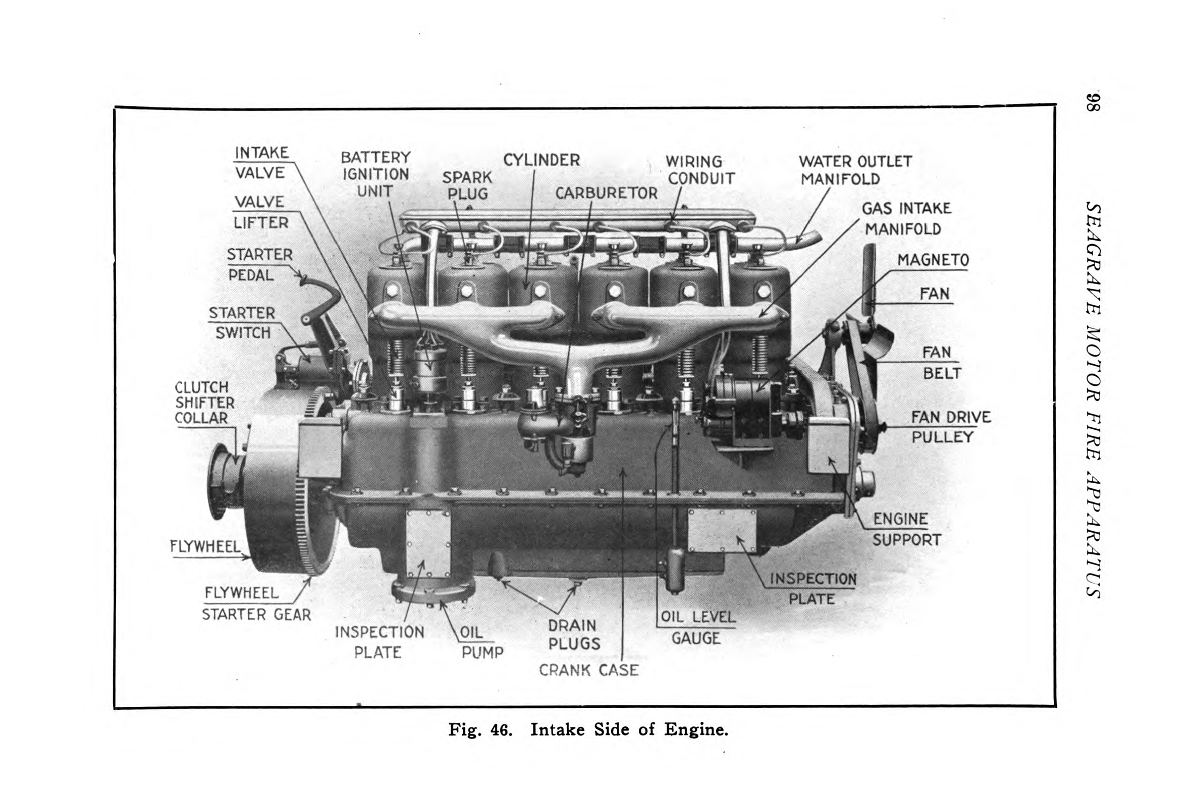 The purpose of the ignition system is to furnish an electric spark in each of the cylinders in the order of their firing. The spark is so timed as to ignite the compressed charge of gas in the combustion chamber at the right instant. The electric current is furnished by a battery or magneto. In Seagrave apparatus both systems are provided, so they may be used independently or together. The magneto is the source of spark used in regular running, and is wired to one set of spark plugs. For starting and emergency use, the storage battery supplies current to a second set of spark plugs thru a vertical ignition unit, consisting of a timer, induction coil and distributor.